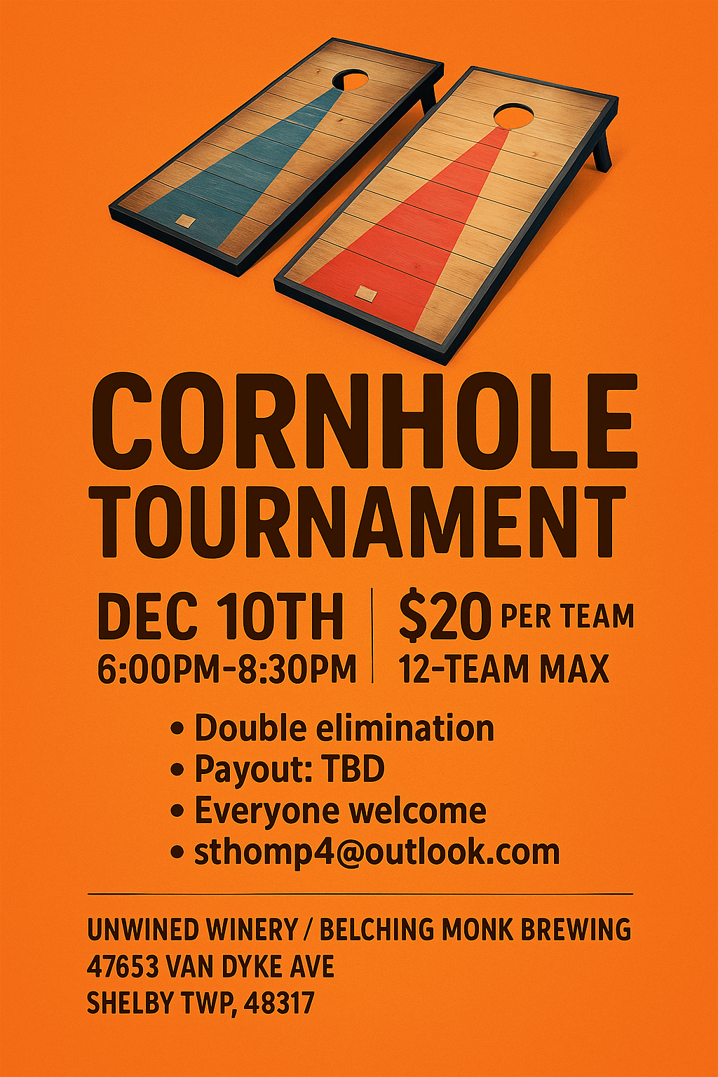 Join us for a fun and competitive double-elimination Cornhole Tournament at Unwined Winery / Belching Monk Brewing!
