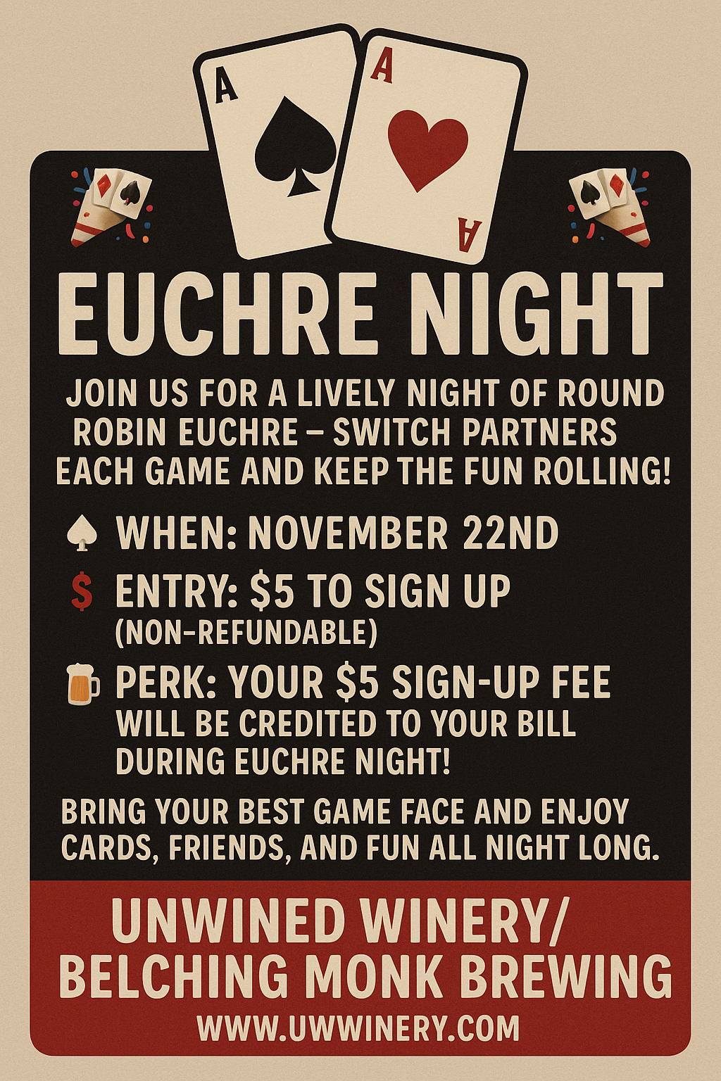 ๐ป Perk: Your $5 sign-up fee will be credited to your bill during Euchre night!
