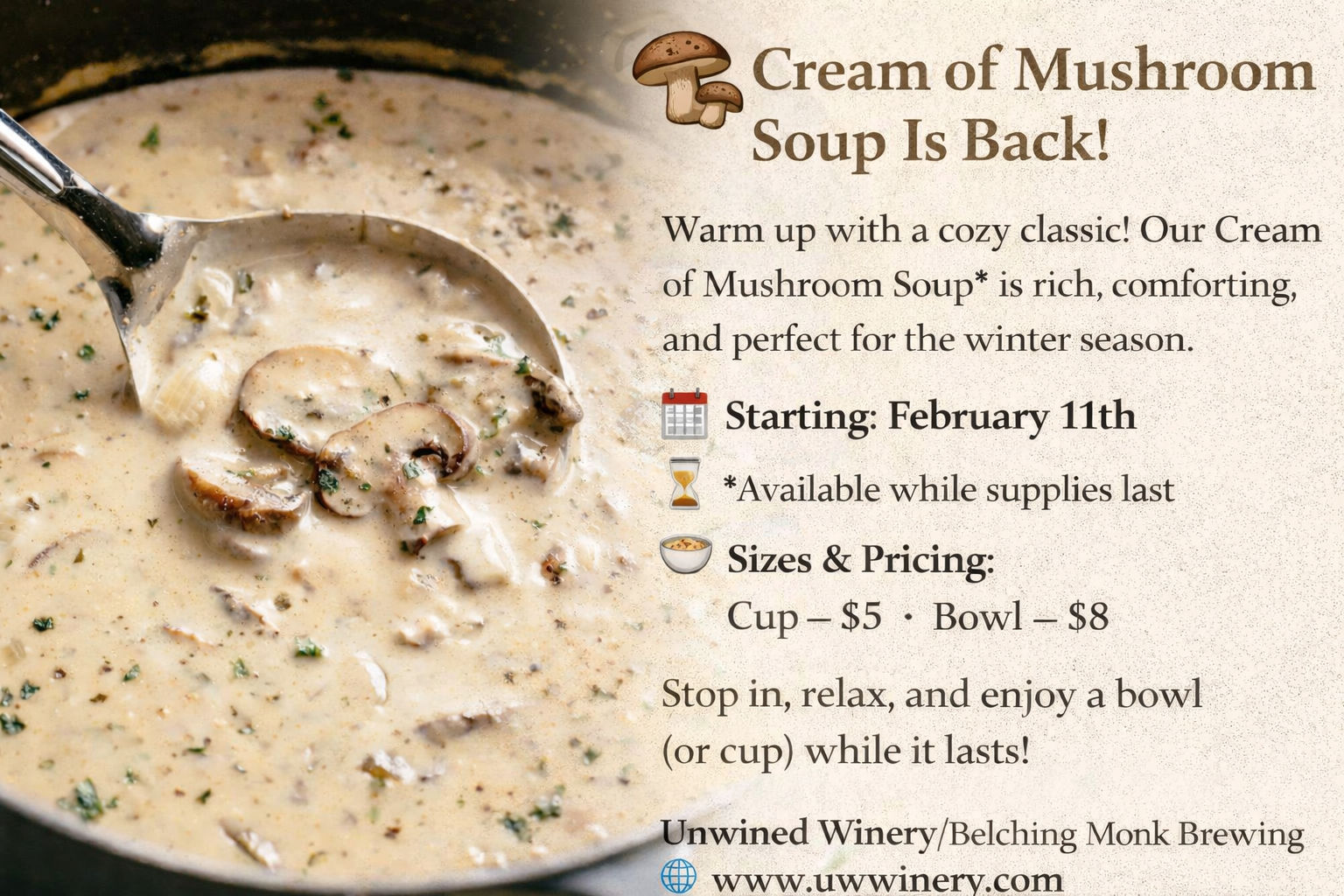 Warm up with a cozy classic! Our Cream of Mushroom Soup is rich, comforting, and perfect for the winter season.