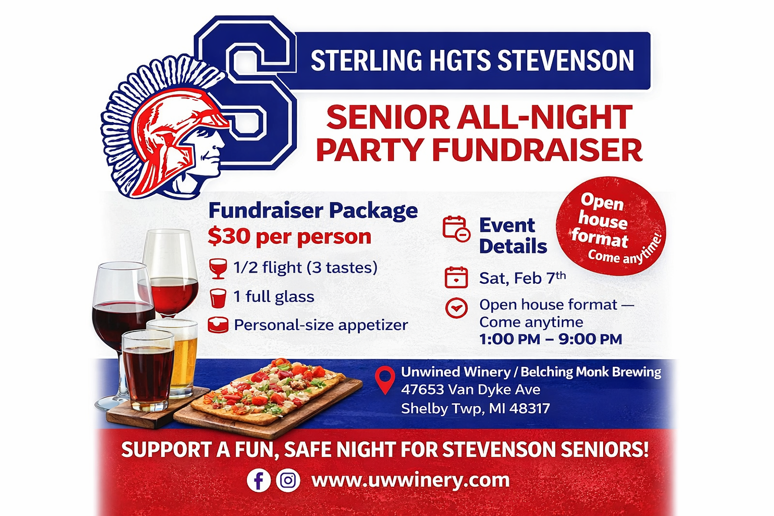 Support the Sterling Heights Stevenson High School Senior All-Night Party with a relaxed afternoon and evening fundraiser at Unwined Winery / Belching Monk Brewing.