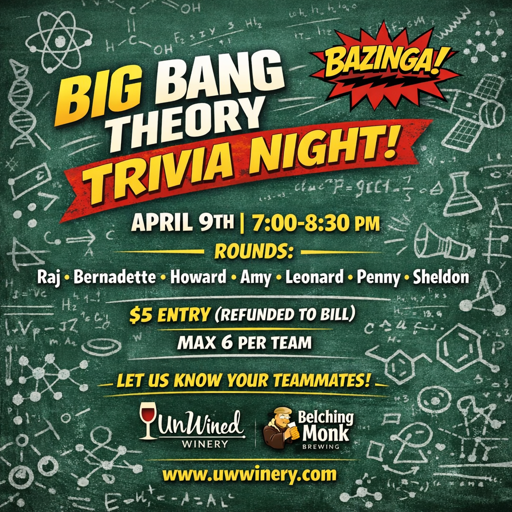 Bazinga! Think you know everything about Sheldon, Leonard, Penny and the whole Pasadena crew? Put your fandom to the test at Big Bang Theory Trivia Night at Unwined Winery / Belching Monk Brewing!