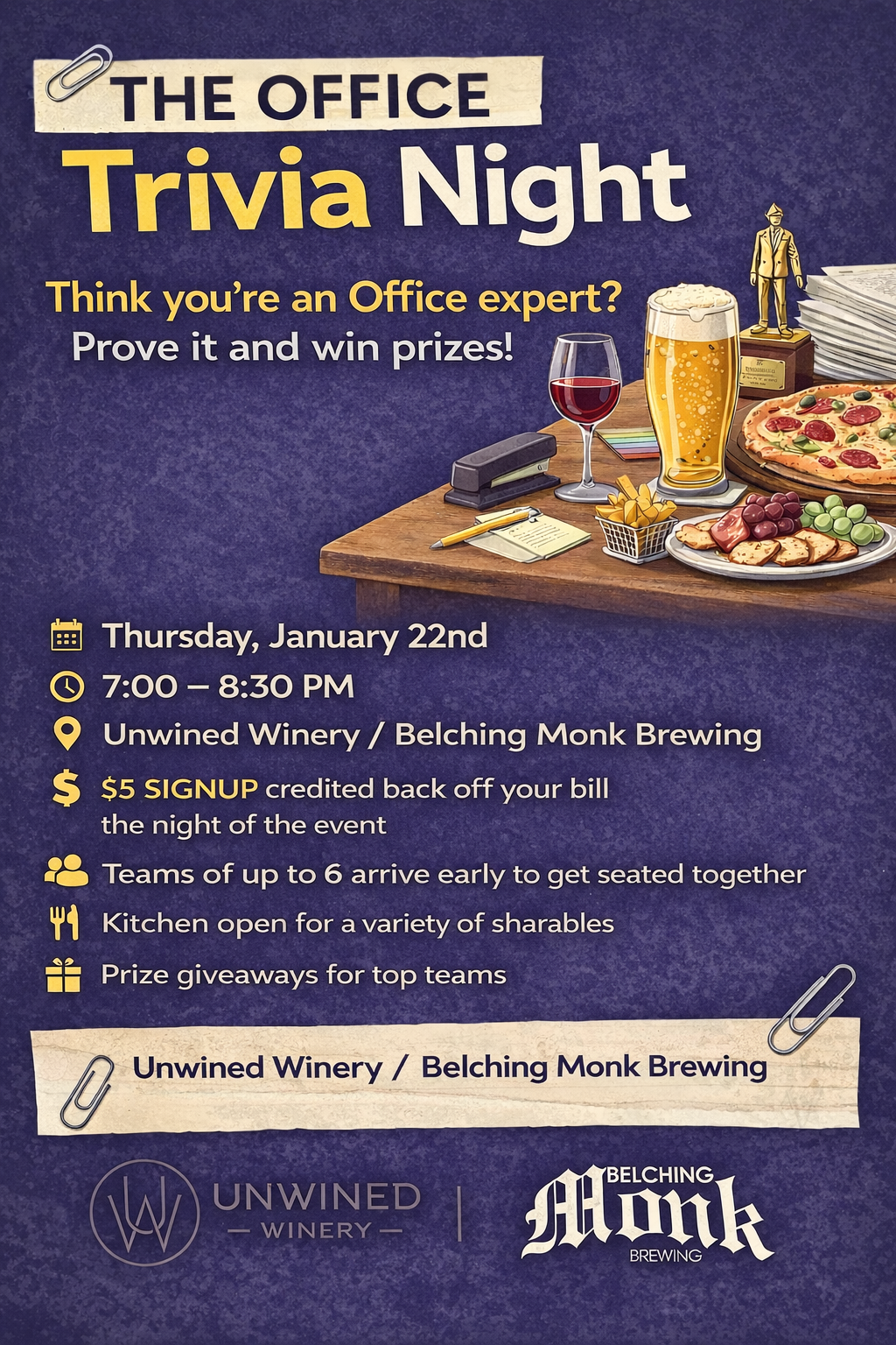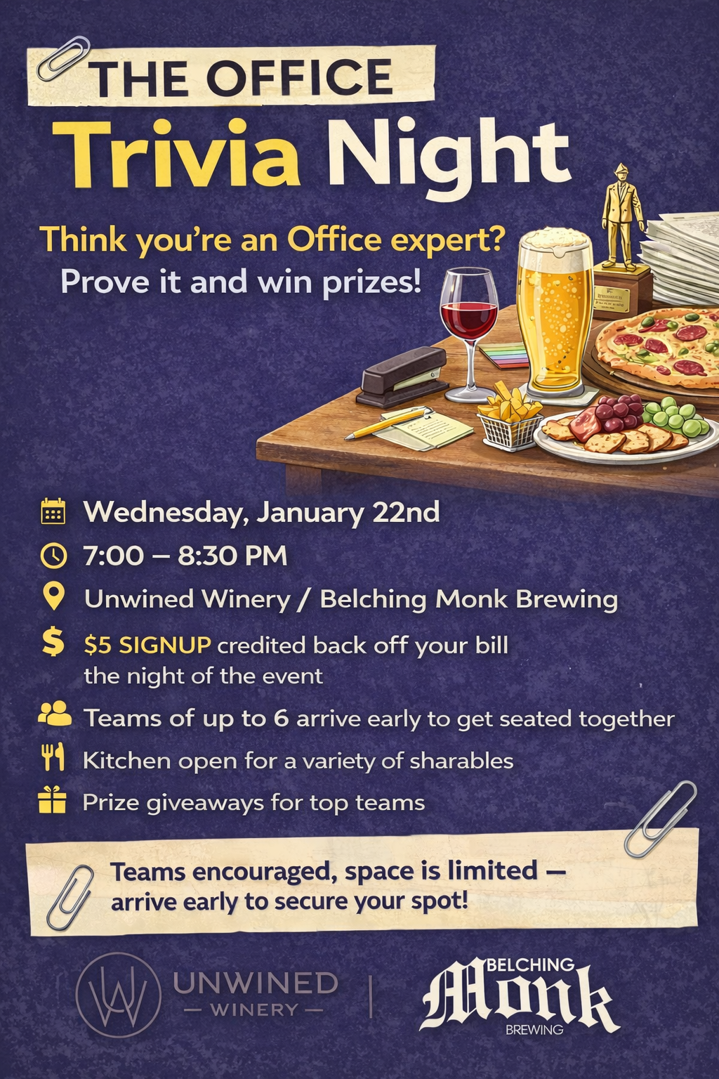 Join us for a fun, fast-paced night of The Office–themed trivia, packed with questions that true fans will love. Gather your team, grab a drink, and see who really knows Scranton best.
